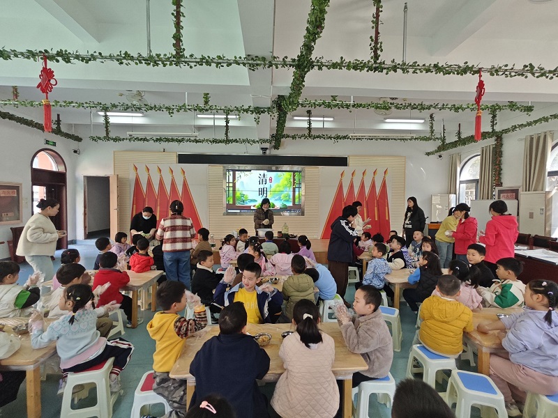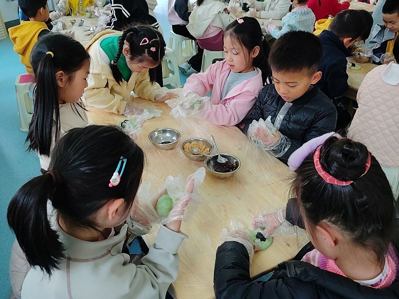大班年级组则在校园内开展了“童心巧手制青团,传统文化润心田”主题活动。孩子们在家长的示范指导下忙得不亦乐乎,搓圆、压平、包馅、塑形,亲手制作出多种口味的青团。当蒸制好的青团出锅,扑鼻的清香弥漫整个教室,孩子们满脸欣喜,迫不及待地品尝着自己的劳动成果,在舌尖上感受传统美食的独特风味。