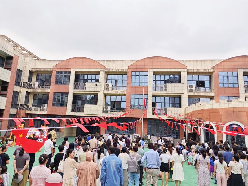 上午8点30分,校园里已洋溢着浓厚的节日氛围。小朋友们身着各具特色的民族服饰,在老师与家长的带领下齐聚操场,参加庄严的升旗仪式。伴随着激昂雄壮的《义勇军进行曲》,鲜艳的五星红旗冉冉升起,稚嫩童声与教师歌声交织,孩子们挺直小小的身姿,仰脸行注目礼,满怀敬意注视着国旗高高飘扬。国旗下,大班小朋友们用稚嫩的语言诉说着对祖国妈妈的祝福与热爱,以及对双节的期待。