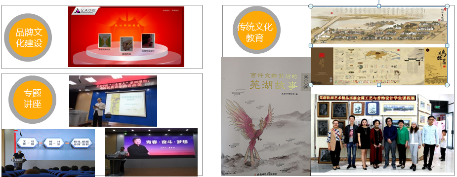 学院以提高青年学生的文化品位为导向,紧密结合学院实际和专业学科特点,构建线上线下全方位的文化育人体系。把中华优秀传统文化融入到日常的思想政治教育过程中,开展廉政文化教育、感恩教育、纪律教育等,涵育师生品行,引领社会风尚。学院还结合传统节庆日、重大事件和开学季、毕业季等关口,以学生会、学生社团为抓手开展的各类学生喜闻乐见的活动,形成“一专业一品牌”的特色文化品牌,提升学院文化的内涵和品位,做到校园文化活动进班级、入社团。利用地方传统手工艺、非物质文化遗产资源,加强学生传统文化和工匠精神教育。编辑出版了《百件文物背后的芜湖故事》手绘本、编印了《鸠兹古镇手绘地图》。编印了《春华秋实-设计师德摇篮》校友风采录(深圳篇),选登40多位在深圳工作的毕业生设计作品与成果,提高学生专业认同感。建成了校内传统文化教育基地《徽州木雕馆》,展出由芜湖画家张月东先生捐赠的863件木雕和20多件绘画作品,让学生亲身感受中国传统文化的博大精深。定期开展博士、教授、杰出校友论坛,举办了中国经典动画赏析、经典广告赏析、民乐赏析、创业成长经历分享等专题报告会,对学生开展美育和创新创业教育。在毕业季工作中,将感恩教育与党团活动、日常管理、毕业服务结合起来,积极营造融洽和谐、诚信感恩、健康活泼、情浓意切的毕业季文化氛围,切实发挥“最后一堂课”教育功能。