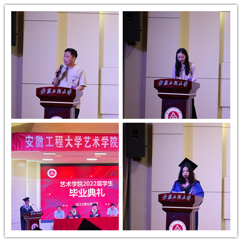 教师代表钱涛、辅导员代表赵玉洁以及本科生、研究生代表先后发言。钱涛老师希望同学们砥砺前行、奋发有为,继续培养心怀光明、积极向上、热爱生活的心态,保持仰望星空、脚踏实地的姿势,不负韶华,创造佳绩。赵玉洁老师回顾了同学们四年的校园生活,希望踏入社会的各位毕业生,扬爱国情,立强国志,践报国行,鼓励毕业生幸福都是奋斗出来的。学生代表先后分享了在艺术学院的奔跑之旅,诠释了对专业的热爱、对信仰的坚持,展现了青春最美的姿态。他们表示,要牢记师长嘱托,在新的人生征程上继续坚定信念,奋力前行,让青春在奋斗中闪光。