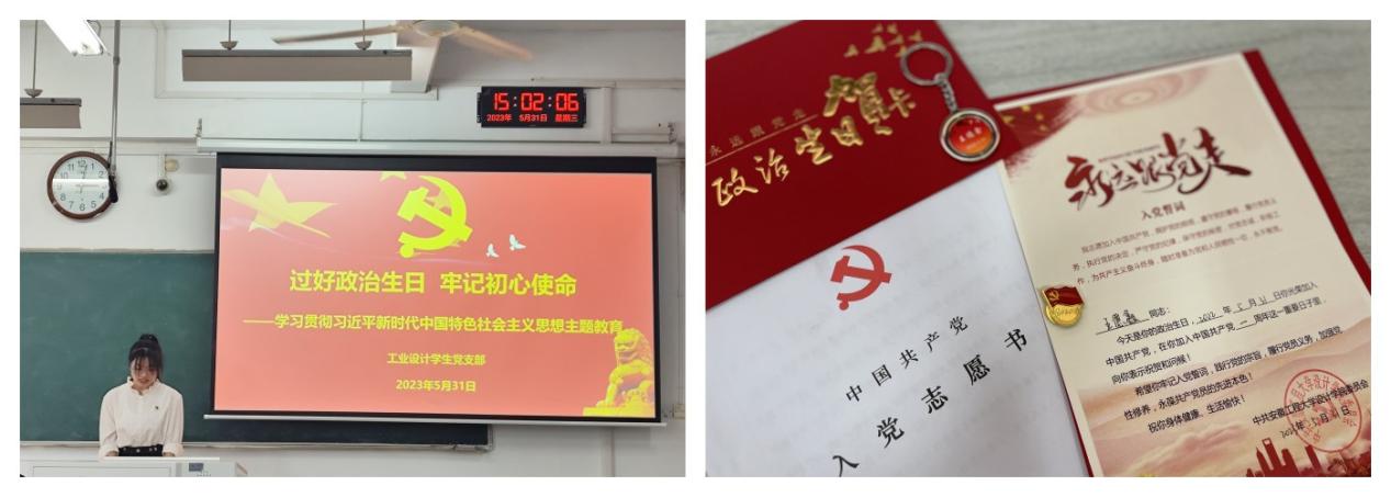 为全面学习贯彻习近平新时代中国特色社会主义思想,深入贯彻落实主题教育精神,进一步推进学校“三全六专”育人工作实践,强化党员身份意识和责任意识,激励党员发挥先锋模范作用,切实增强党组织的战斗堡垒作用,5月31日下午,设计学院工业设计学生党支部开展“过好政治生日,牢记初心使命”主题党日活动,通过“七个一”系列仪式,对学生党员开展理想信念再教育、责任使命再承诺、党性锤炼再提高。设计学院党委副书记彭海燕、组织员张焱、辅导员代表袁自坤、支部全体党员以及入党积极分子代表参加了此次活动。会议由工业设计学生党支部书记李荣杰主持。