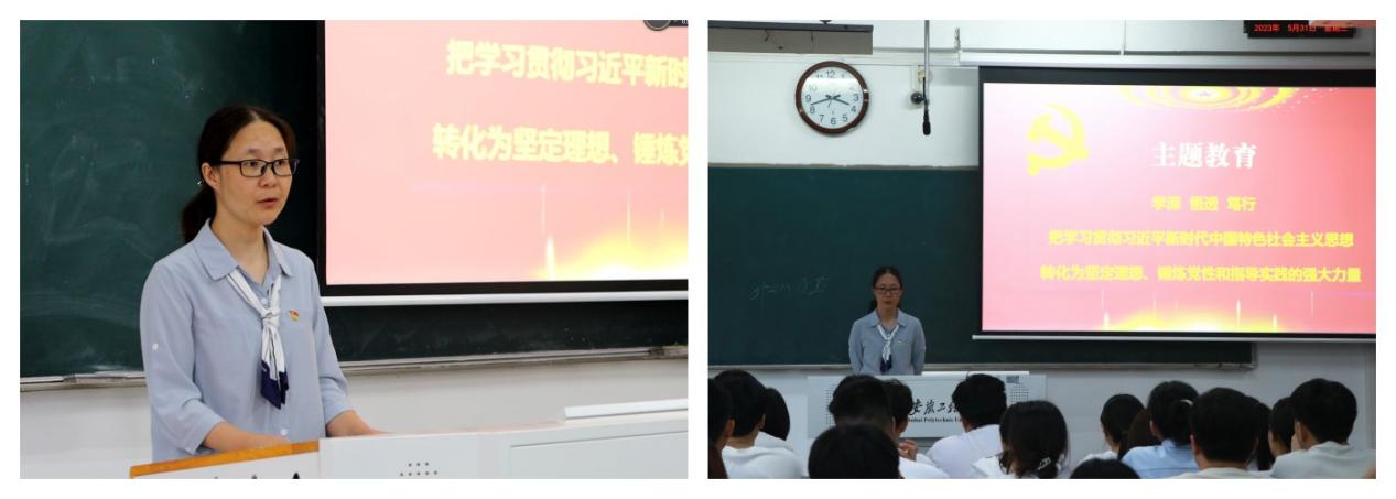 彭海燕书记以“学深悟透笃行,把习近平新时代中国特色社会主义思想转化为坚定理想、锤炼党性和指导实践的强大力量”为题讲授主题教育专题党课,带领大家一起学习习近平新时代中国特色社会主义思想和党的二十大精神,助力支部党员筑牢信仰之基、补足精神之钙、把稳思想之舵,自觉做习近平新时代中国特色社会主义思想的坚定信仰者、积极传播者、忠实实践者。同时,她鼓励即将迈出校门的毕业生党员,在工作岗位上担当作为,牢记初心使命,继续砥砺前行,奋力建功新时代。