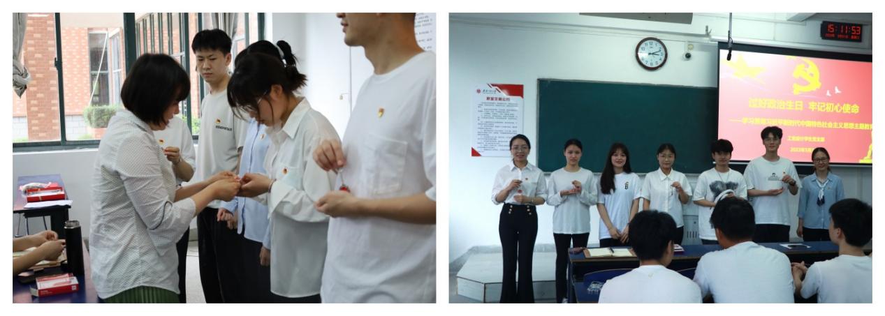 为鼓励新党员赓续优秀党员的光荣传统,会上举行“老党员为新党员佩戴党员徽章”仪式,老党员张焱、袁自坤老师和4名2023届毕业生党员郑重地为新党员佩戴党员徽章,以传递党员的责任意识和担当精神,鞭策新党员坚定信仰、坚守初心,不断加强学习,在习近平新时代中国特色社会主义思想指引下奋力前行。