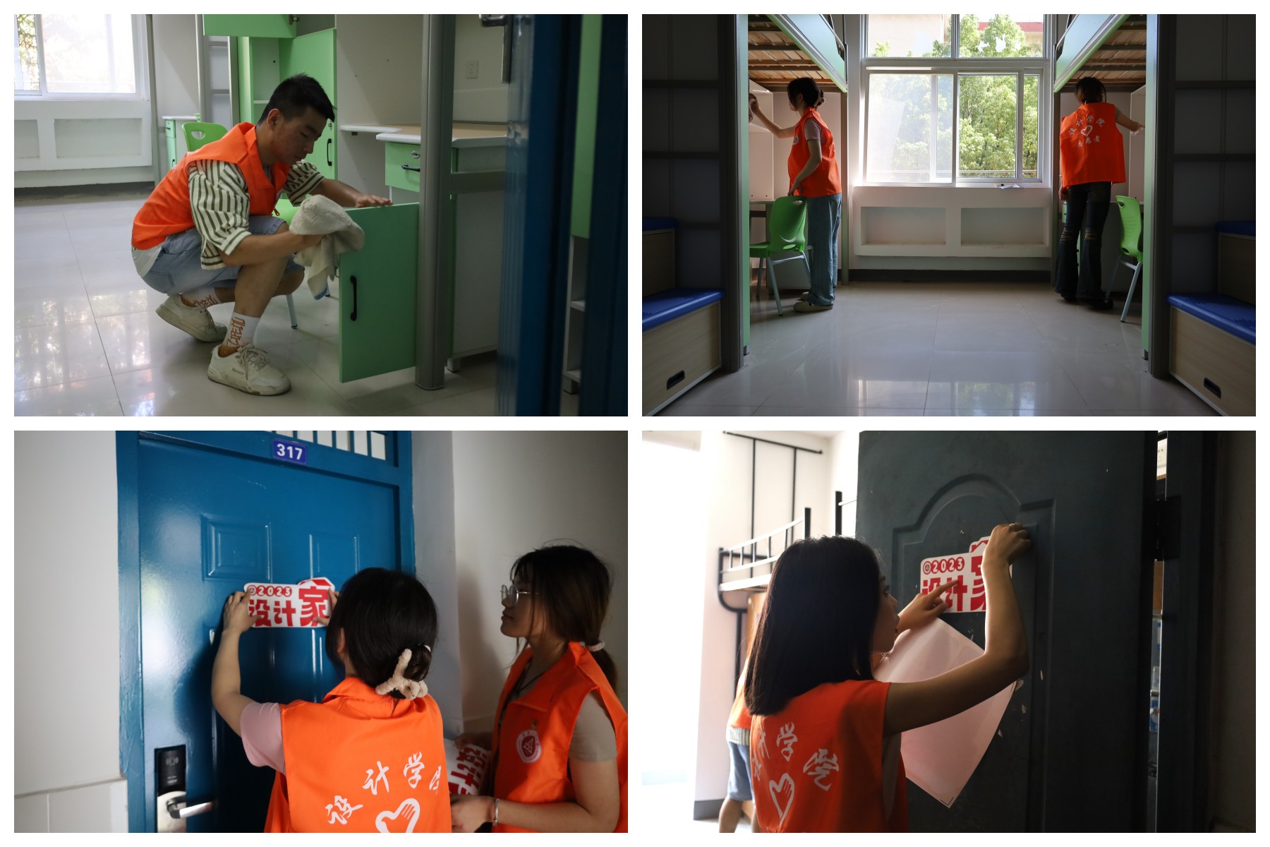 活动前,设计学院对党员志愿者们进行了明确分工,分专业以小组为单位承担每一间新生宿舍的清洁工作。大家自带清扫工具,密切配合,对宿舍的桌面、衣柜进行了清洁,并为所有宿舍张贴由学院团委学生会自主设计的“2023设计家”门贴。虽已初秋,但暑热未消,志愿者们脸颊的汗水彰显着奉献的力量,忙碌的身影散发出青春的色彩。在大家的共同努力下,设计学院所有新生宿舍环境焕然一新。