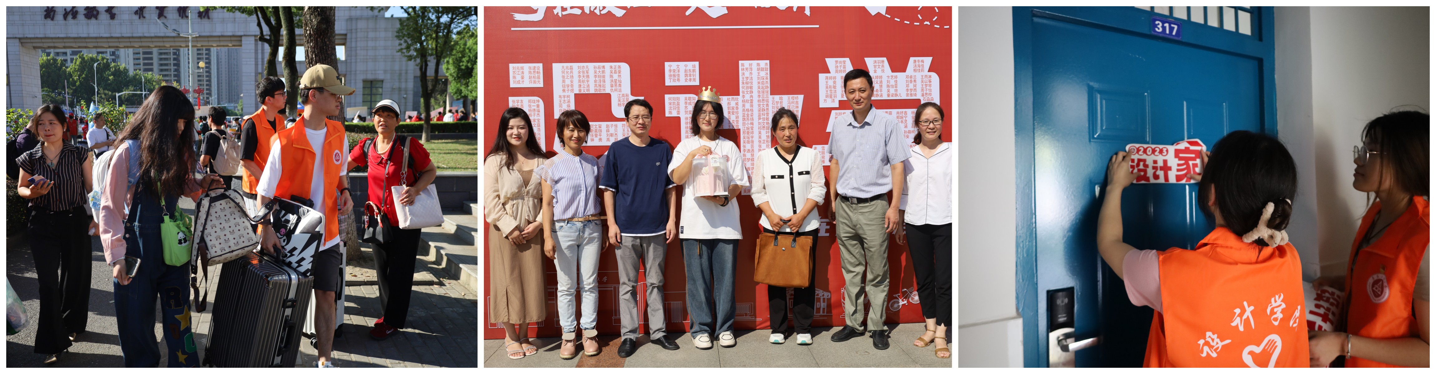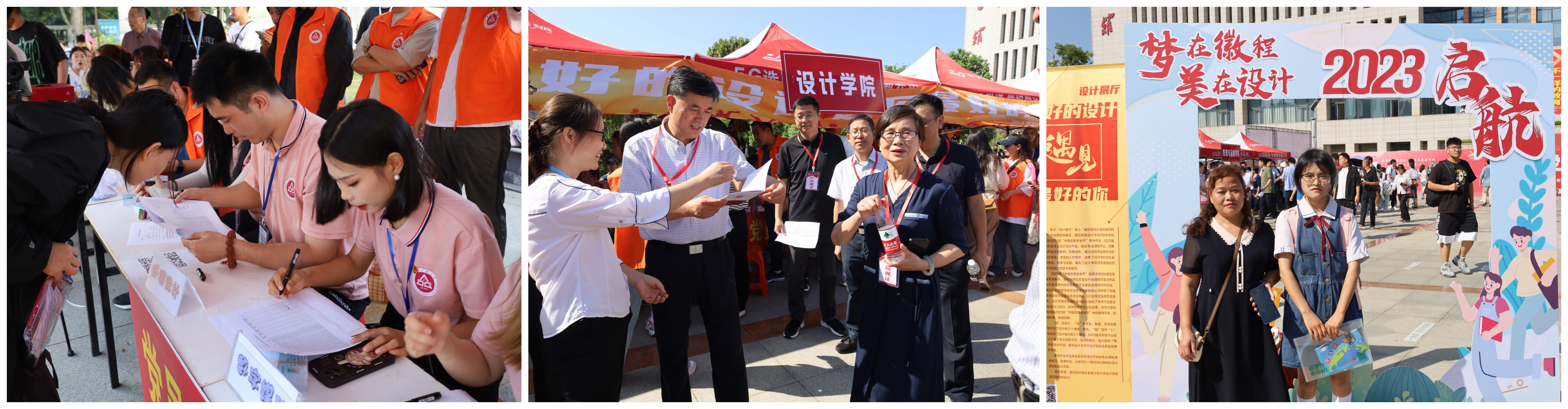 9日清晨,设计学院师生早早便开始了迎新准备工作。为了给新生一个最美的“初见”,学院布置了“自”家专属“签名墙”、“我与徽程的第一张合影”拍照打卡点等,方便新生与家长合影留念。一个个逗趣的手持牌、一条条温暖的标语、别具特色的微展览......都饱含着对新生们的真诚祝愿。报到处现场,辅导员老师带领学生志愿者以良好的精神风貌迎接每一位新生。学院党政领导在现场迎接新同学,了解学生报到实时数据,和新生家长亲切交谈,表达对新同学的期望与祝福。