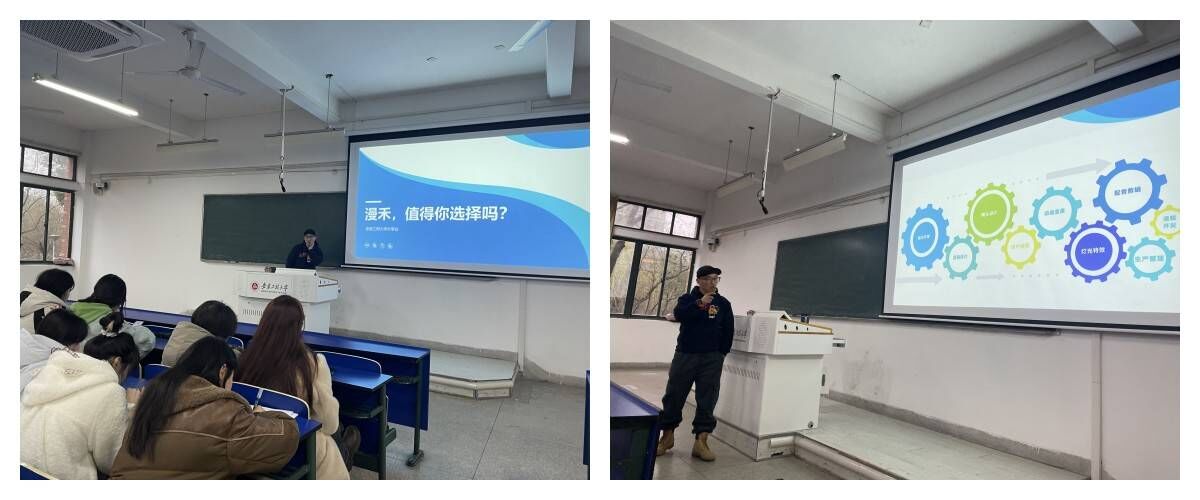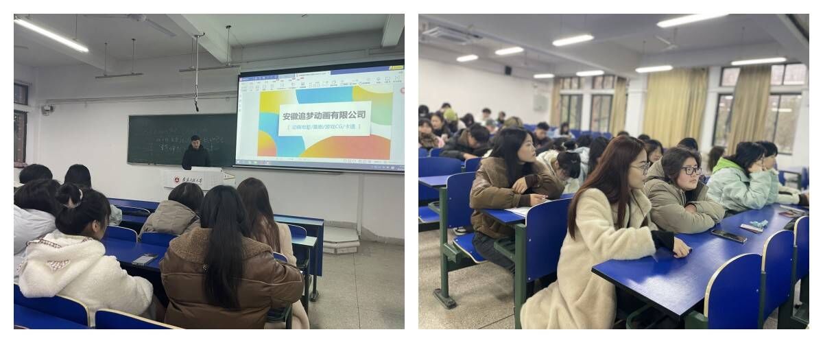 本次宣讲会的“主角是来自杭州漫禾动漫有限公司和安徽追梦动画有限公司的企业代表。漫禾动漫的宣讲嘉宾胡斌帅为我校2004级工业工程专业校友,他满怀感激之情地回顾了母校对他的栽培与教育,分享了自己在职业道路上的成长与奋斗,为同学们提供了宝贵的职业规划建议。两家企业分别介绍了公司的发展历程、核心业务、人才培养策略以及校园招聘计划,与毕业生现场进行了互动交流。宣讲会现场,还有不少低年级学生前来聆听,他们表示希望在校期间多参加此类活动,了解目前就业形势,找准就业方向,提前为日后职业做好规划。