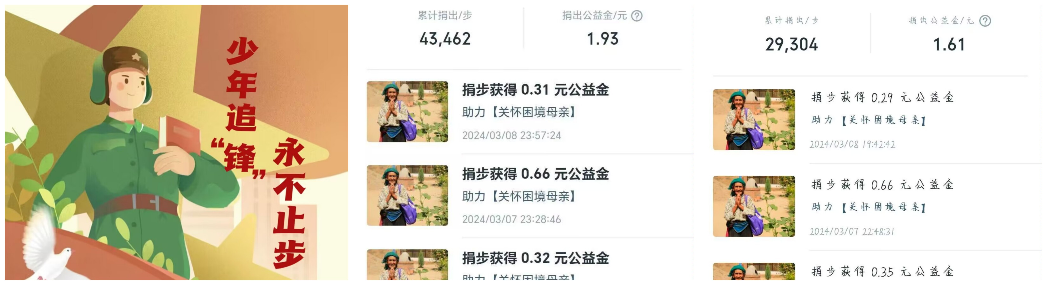 生命不息、运动不止。设计学院团委学生会举办“少年追‘锋’ 永不止步”公益捐步活动,带领学院学子“正”起来、“壮”起来。通过“一块走”微信小程序,参与人员在规定时间内利用课余时间健步走,每6000步兑换公益金进行公益资助项目。“捐步”行为在各班级流行推广,甚至还开始了一种新形式的“攀比”。“为了让自己步数占到头榜、累计步数和公益金越来越多,我们平时去散步的频率都高了起来。”数媒231班李冉笑着说。