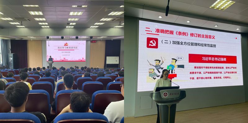 常务副院长张学东主持教师党员和非毕业班学生党员读书班专题教育,并领学《中国共产党纪律处分条例》总则部分内容。学院党委副书记彭海燕做《中国共产党纪律处分条例》辅导报告,从深刻认识修订《条例》的重要意义、准确把握《条例》修订的主旨意义、抓好《条例》的贯彻执行,以严明的纪律推进党的自我革命三个方面进行深入解读,让党员对党的纪律要求有了更加清晰、更加深刻的认识。她强调要把学习贯彻《条例》作为重要政治任务,以严明的纪律推进党的自我革命,不断提升党员干部的政治素养和拒腐防变能力,使廉洁自律规范内化于心、外化于行,守住纪律底线、不越法律红线,切实以学纪、知纪、明纪、守纪的优良纪律作风保障学院事业高质量发展。 全体党员集中观看了反腐倡廉警示教育片《永远吹冲锋号》第四集《永远在路上》。
