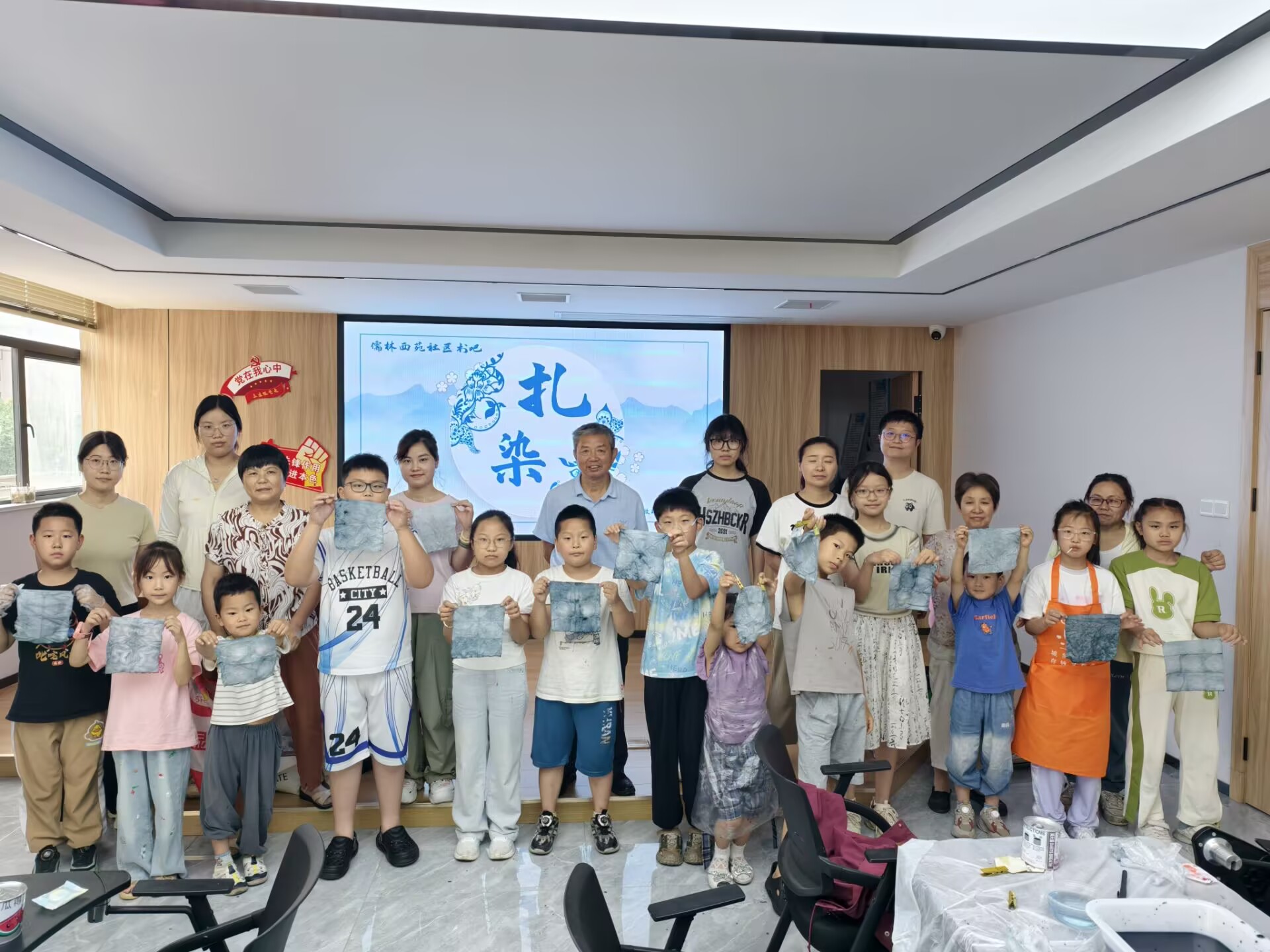 望春兰蓝染实践队分别在学府社区和儒林西苑社区开展义务扎染志愿活动,近50组家庭踊跃参与。活动现场,队员们提前准备好蓝染原料、工具和空白布料,耐心向家长和孩子们讲解扎染的基本原理、经典纹样及操作技巧。从简单的捆扎、打结,到浸入染缸等待显色,孩子们在家长的协助下全神贯注地完成每一个步骤。当一幅幅带着独特花纹的作品被展开时,现场充满了欢声笑语。一位家长表示:“这样的活动既能让孩子体验动手的乐趣,又能接触到传统文化,非常有意义。”